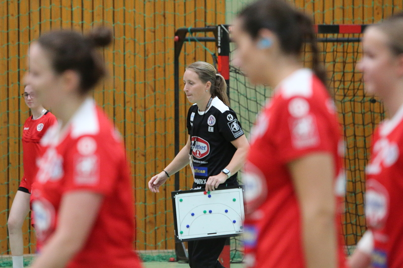 Das Spiel war bereits nach 30 Minuten entschieden – sichtlich zufrieden vor dem Anpfiff zur zweiten Halbzeit Axel Weinand und Torfrau Alex Irmgartz, die bis dahin mit einer bärenstarken Leistung nur 6 Gegentore zugelassen hatte.